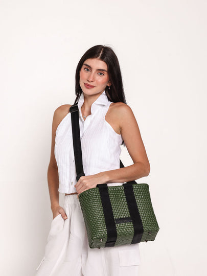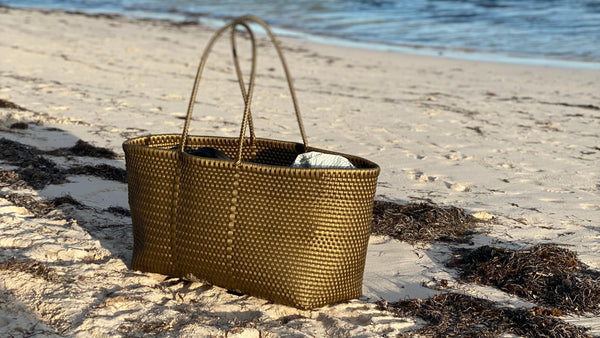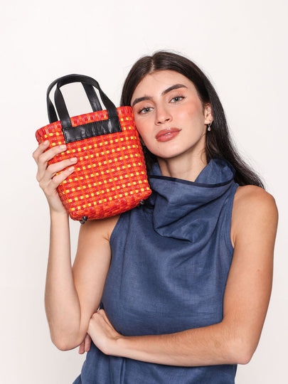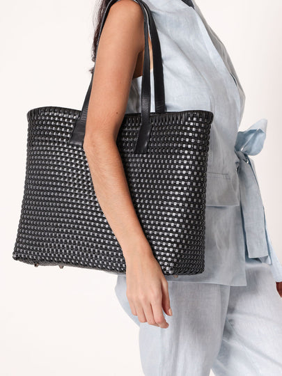 Handwoven from recycled plastic, finished with buttery-soft leather handles, and complete with a removable pouch, your new everyday icon.